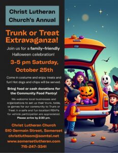 Mark your calendars for CLC’s 11th Annual Trunk or Treat on Saturday, October 25th from 3-5 pm. Decorate your car trunk or truck bed and hand out treats! Park in the upper level lot by 2:30 pm and be ready for the FUN! Hotdogs & chips will be served. Volunteers are always welcome! Bring food or cash donations for the Community Food Pantry. We also invite local businesses, nonprofits and organizations to set up their trunk/games/table for our community to Trunk or Treat in a safe and fun location! EVERYONE can be a part of this community-wide event! Please try to RSVP your vehicle participation to the church office at 715.247.3341 or christluthsom@somtel.net.