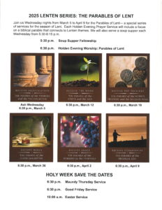 Join us Wednesday nights until April 9th for the Parables of Lent – a special series of services for the season of Lent. Each Holden Evening Prayer Service begins at 6:30 pm and will include a focus on a biblical parable that connects to Lenten themes. We will also serve a soup supper each Wednesday from 5:30-6:15 pm.